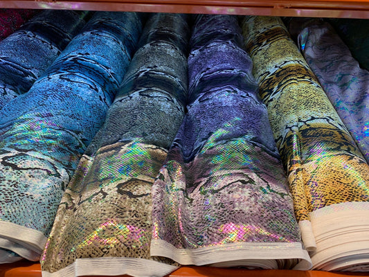 King snake design with iridescent foil nylon spandex 4way stretch 58/60" Sold by the YD. Ships worldwide from Los Angeles California USA.