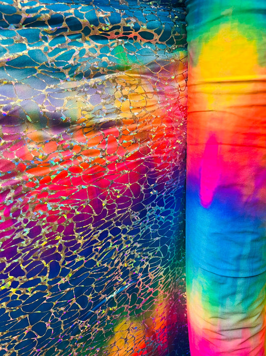 Tie dye Hologram metallic foil on nylon spandex 4way stretch 58/60" Sold by the YD. Ships worldwide from Los Angeles California USA