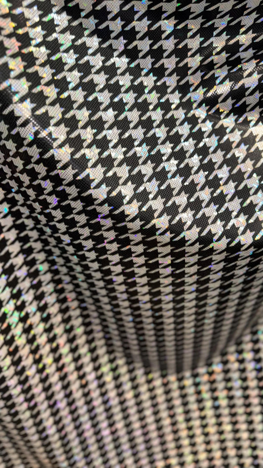 Houndstooth design on Shattered Glass metallic hologram nylon spandex White/Silver/Black 4-way stretch 58/60" Sold by the YD.
