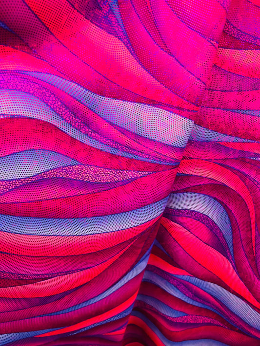 New Modern Abstract Lava Magma Design With Hologram foil nylon spandex 4-Way Stretch 58/60” Sold By The YD. Ships Worldwide From Los Angeles