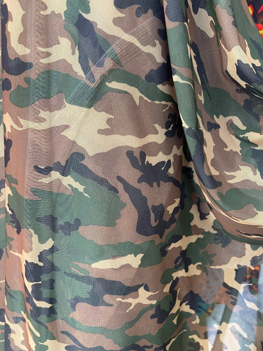 Camouflage design print on Power mesh 4-way stretch 58/60” Sold by the YD. Ships Worldwide from Los Ángeles California USA.