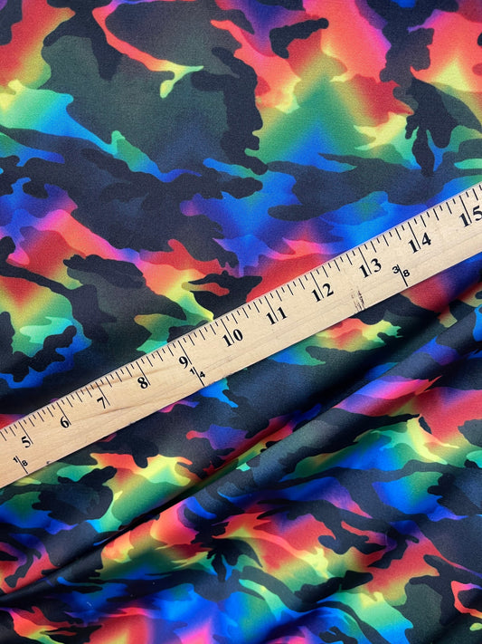 Camouflage design rainbow color print on great quality of Nylon spandex 4-way stretch 58/60” Sold by the YD. Ships Worldwide from L.A