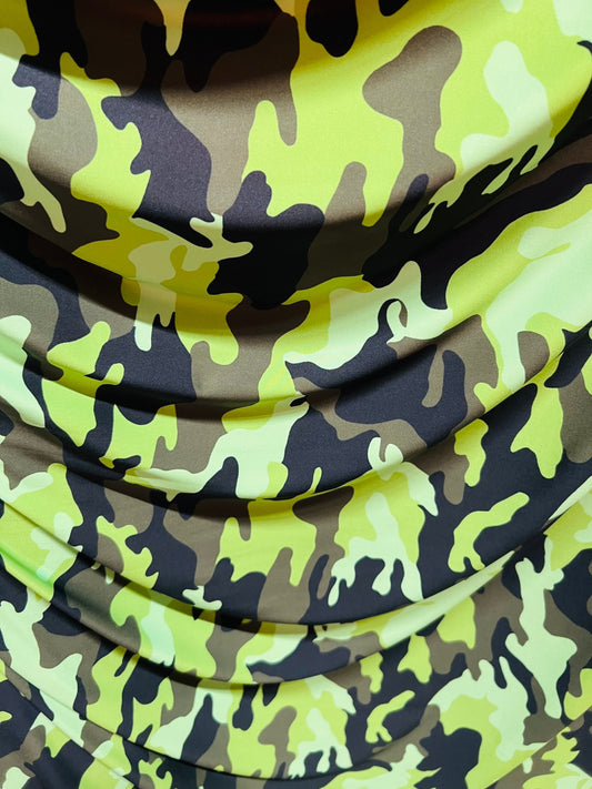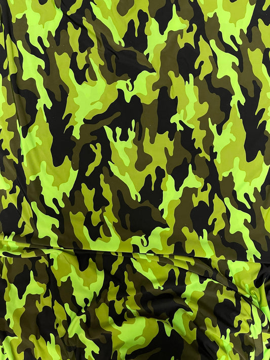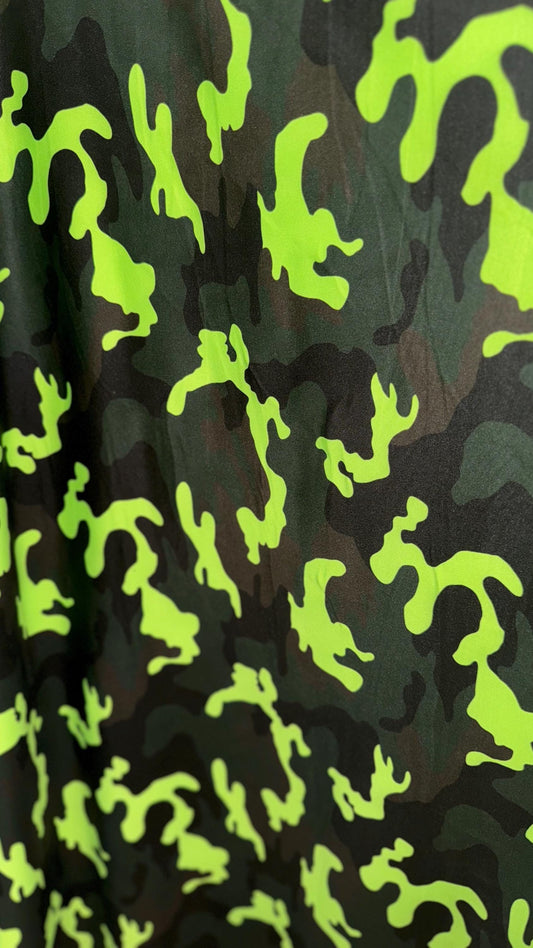 Camouflage design neon green/multi print on great quality of nylon spandex medium weight 4-way stretch 58/60” Sold by the YD.