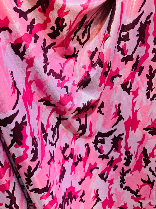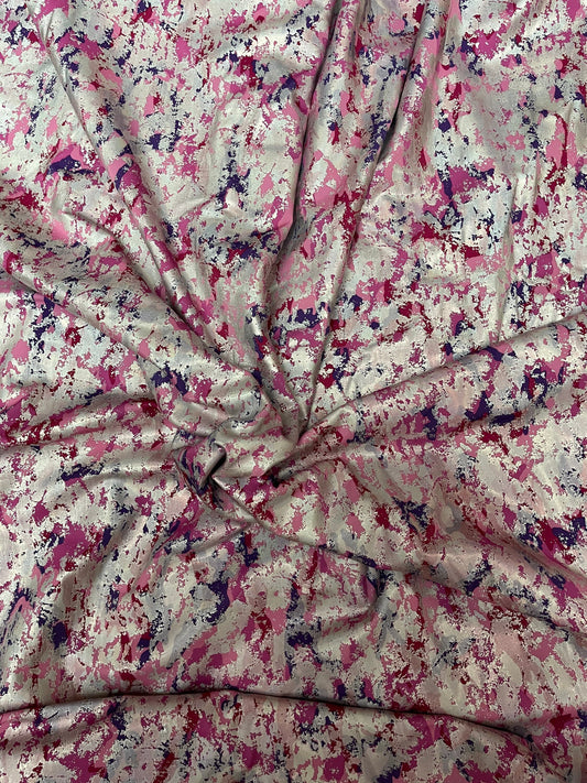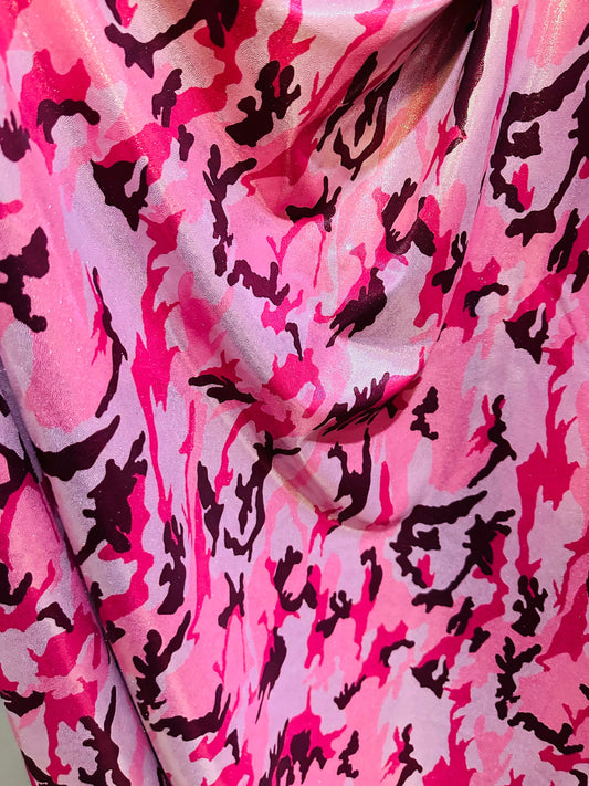 Camouflage Luxury design Pink Multicolor metallic nylon spandex with foggy foil 4-way stretch 58/60”