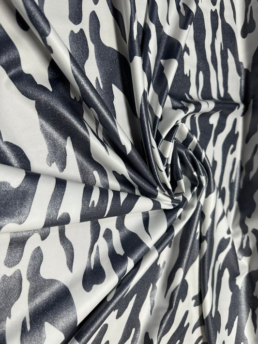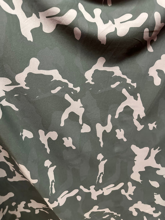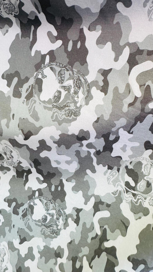 Camouflage design White/Gray print on nylon spandex 4-way stretch 58/60”
