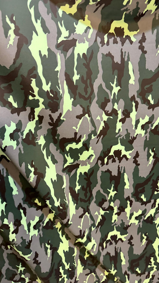 Camouflage design neon colors print on poly spandex 4-way stretch 58/60”