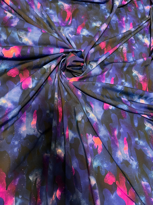 Camouflage UV-light it glows in the dark with black light great quality of nylon spandex 4-way stretch 58/60” Sold by the YD.