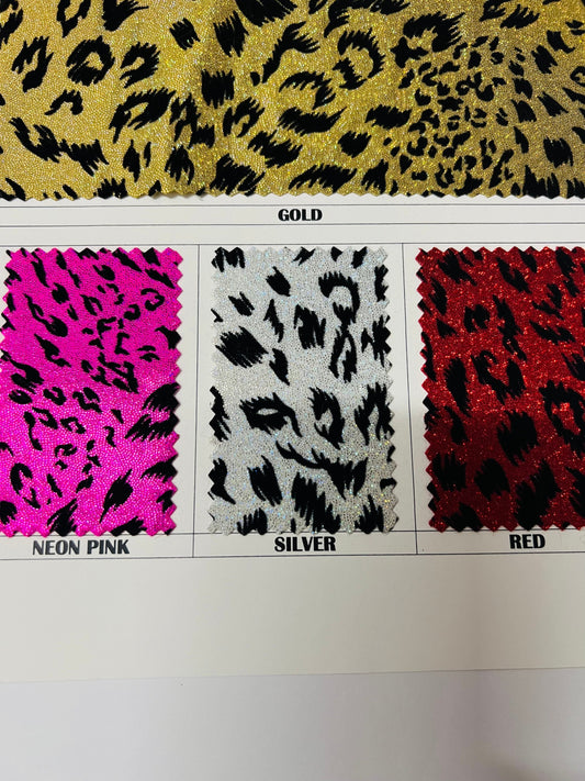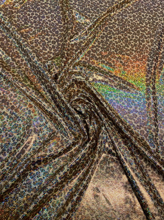 Cheetah hologram design New metallic hologram nylon spandex 4-way stretch 58/60” Sold by the YD. Ships worldwide from Los Angeles CA USA.