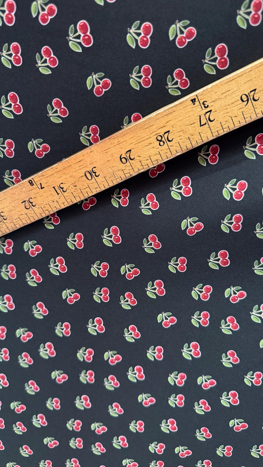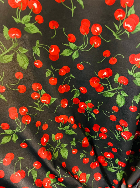 Cherry design Black/Red print on great quality of nylon spandex 4-way stretch 58/60” Sold by the YD. Ships Worldwide from Los Angeles CA