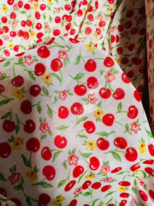 Cherry design print on best quality of power mesh nylon spandex 4-way stretch 58/60” Sold by the YD. Ships Worldwide from Los Angeles CA
