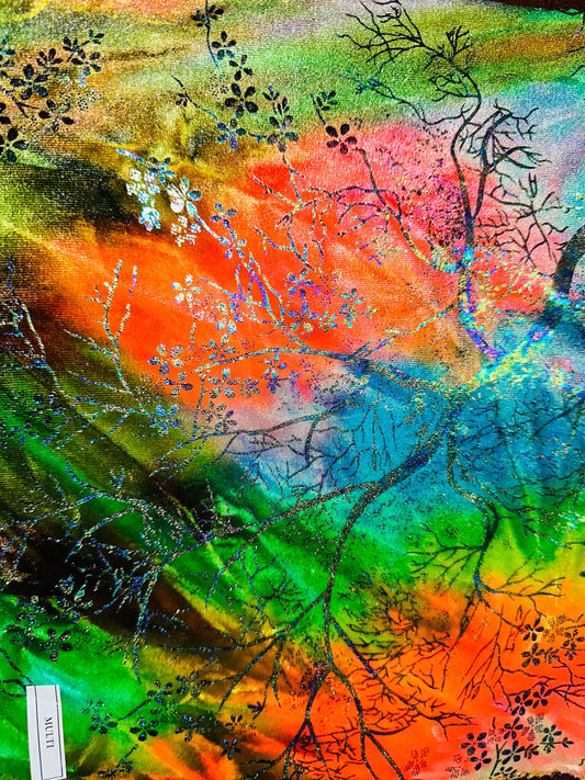 New Magic Flourish design Black/Multicolor Best quality of nylon spandex with foggy foil 4-way stretch 58/60”