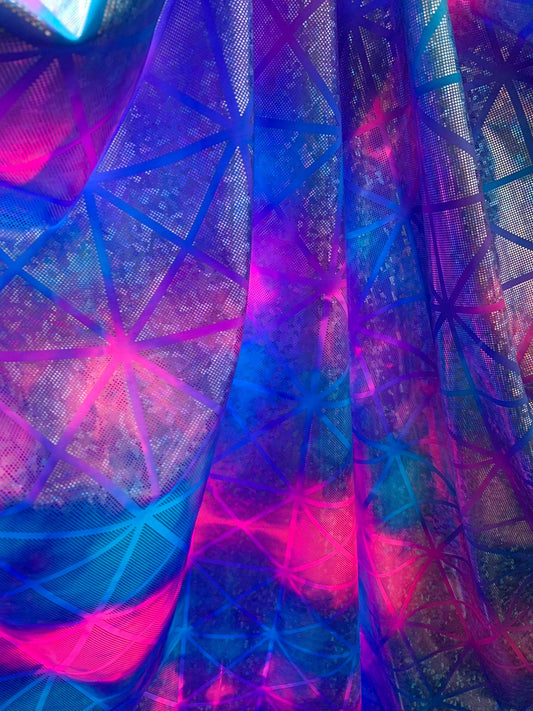 Cotton candy Geometric desing hologram tie dye nylon spandex 4way 58/60" sold by the yd. Ships worldwide from Los Angeles California USA.