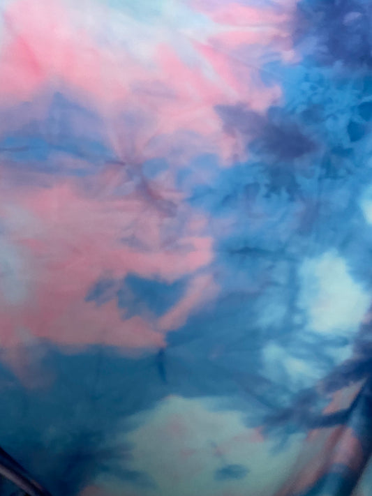 Cotton candy tie dye nylon spandex 4-way stretch 58/60” Sold by the YD. Ships worldwide from Los Angeles California USA.
