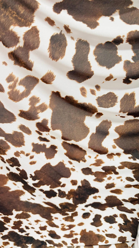 Cow design white/brown print on great quality of nylon mesh 4-way stretch 58/60” Sold by the YD. Ships Worldwide from Los Angeles California