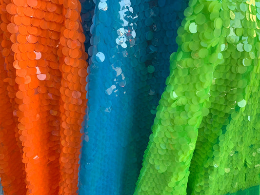 New neon colors paillette sequins 20mm shining seq on stretch mesh base 2way 58/60" Sold by the YD. Ships worldwide from Los Angeles CA USA.