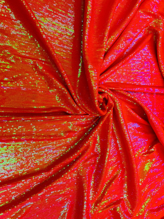 New Neon orange paillette sequins Iridescent orange 20mm size round sequins on stretch mesh 2-way 58/60” Sold by the YD. Ships worldwide.