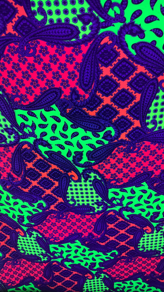 New paisley design Neon colors multicolor print on poly spandex jersey 4-way stretch 58/60” Sold by the YD. High quality fabrics