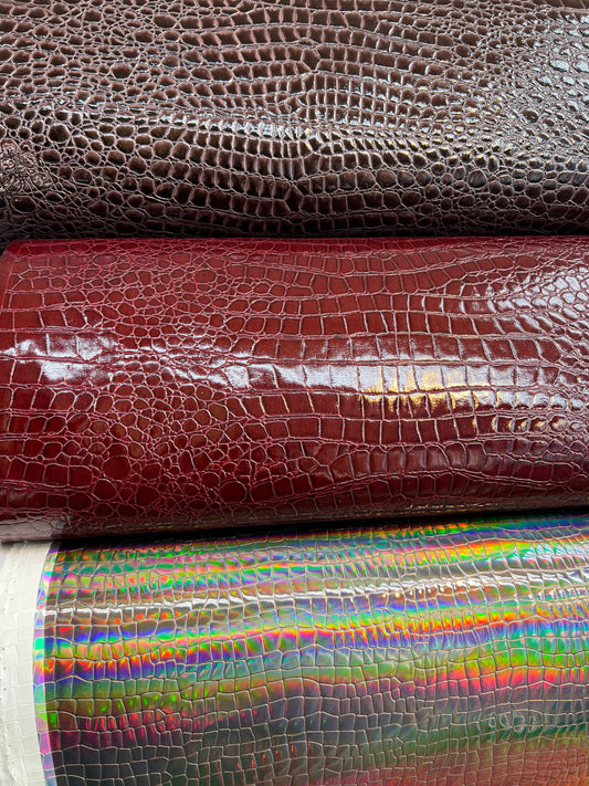 Crocodile design super shiny vinyl non stretch 58/60” Sold by the YD. Ships worldwide from Los Angeles California USA.
