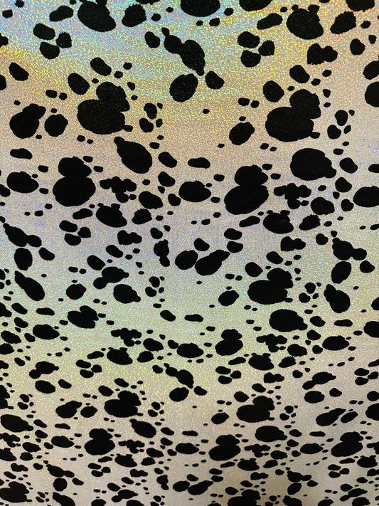 Dalmatian design on hologram foggy foil metallic nylon spandex 4-way stretch 58/60” Sold by the YD. Ships worldwide from L.A