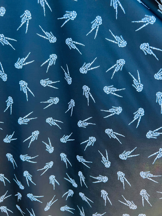 New Skeleton Hand design print on best quality of Nylon Spandex 4-way stretch 58/60” Sold by the YD. Ships Worldwide from Los Angeles CA.