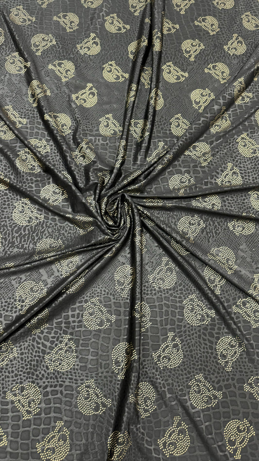 New skull design on embossed metallic poly spandex 2-way stretch 58/60” Sold by the YD. Ships worldwide from Los Angeles California USA