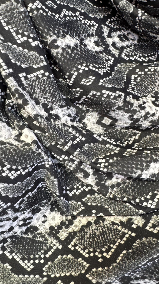 New snake print white/black print on nylon spandex 4way stretch 58/60" Sold by the YD. Ships worldwide from Los Angeles California USA.