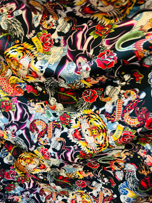 Deluxe Japanese Tattoo design print on Crepe Back Luxury satin non stretch 58/60” High Quality fabrics by AlexLAFabrics
