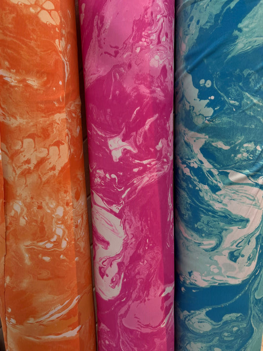 New tie dye ribbed nylon spandex 4-way stretch 58/60” Sold by the YD. Ships Worldwide from Los Angeles California USA.