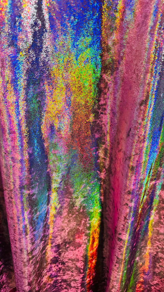 Oil slick hologram nylon spandex iridescent all over foil 4-way stretch 58/60” Sold by the YD. Ships worldwide from Los Angeles CA