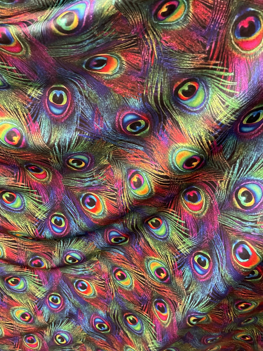 Peacock feathers design rainbow print on nylon spandex 4way Stretch 58/60” Sold by the YD. Ships worldwide from Los Angeles California USA.