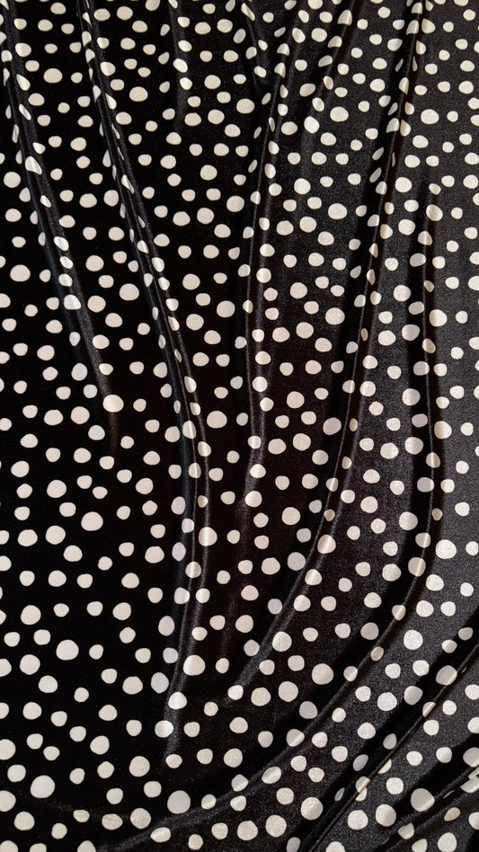 Pebbles design black/white on stretch luxury silky velvet 58/60” Sold by the YD. Ships Worldwide from Los Angeles California USA.