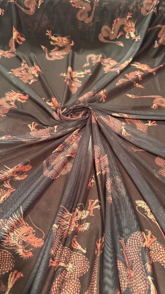 Dragon Exotic design Black/Rust Color print on power mesh nylon spandex 4-way stretch 58/60” Sold by the YD. Ships worldwide from L.A CA
