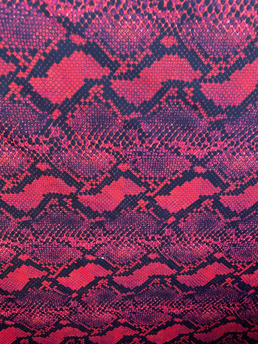 Serpent design Red/black print on nylon spandex 4-way stretch 58/60” Sold by the YD. Ships worldwide from Los Angeles California USA.