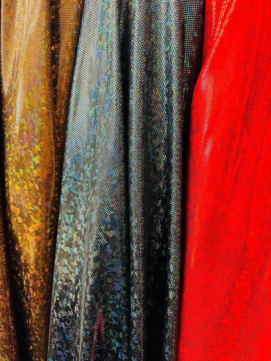 Shattered glass hologram metallic nylon spandex 4-way stretch 58/60” Sold by the YD. Ships Worldwide from Los Ángeles California USA.