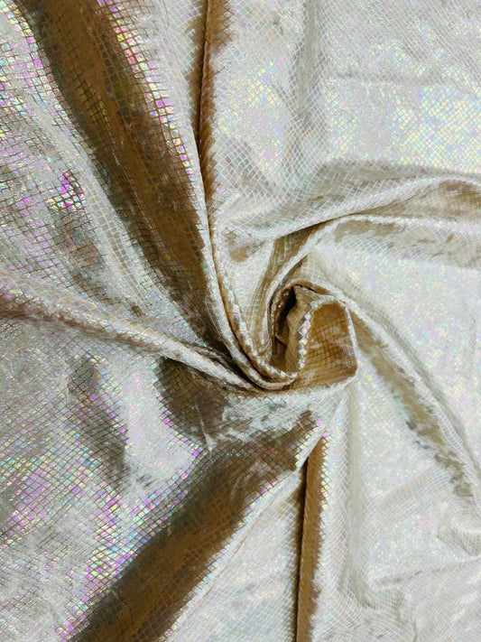 Dragon skin design metallic stretch velvet with ilusión foil nude color 4-way stretch 58/60” Sold by the YD. Ships Worldwide from Los CA