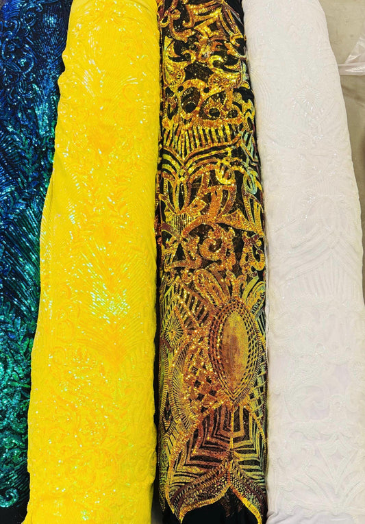 Elegant geometric design iridescent sequins embroidered on stretch mesh 4-way 50/52” Sold by the YD. Ships Worldwide from Los Angeles cali