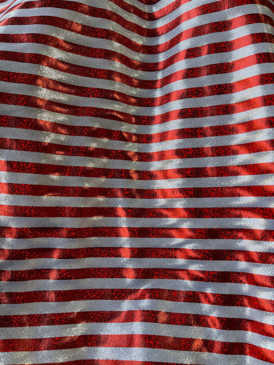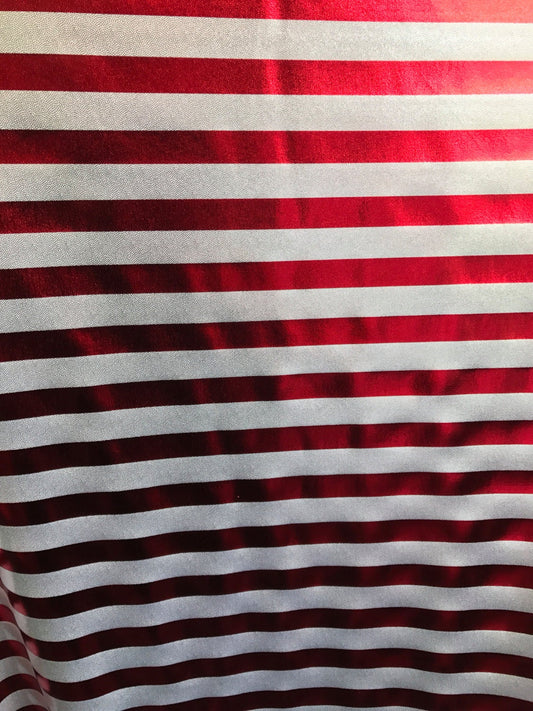 Stripe design nylon spandex 4way metallic foil silver/red 58/60" sold by the Yd. Ships worldwide from Los Angeles California USA.