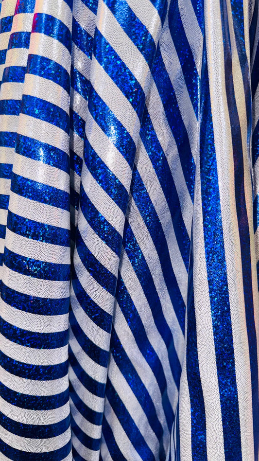 Stripe design nylon spandex 4way Hologram metallic foil Blue/Silver 58/60" sold by the Yd. Ships worldwide from Los Angeles California USA.
