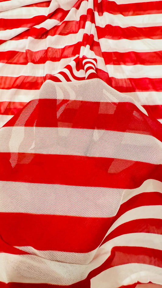Stripes design 1” size Red/White print on power mesh 4-way stretch 58/60” Sold by the YD. Ships Worldwide from Los Angeles California USA.