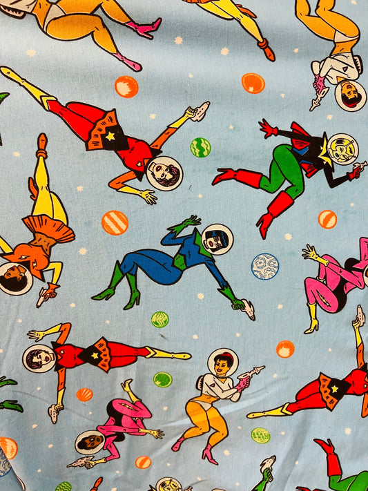 Superwoman cartoon design print on heavy quality of cotton spandex 12 Oz 2-way stretch 58/60” Sold by the YD.
