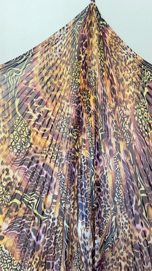 Sunburst pleated Silky Chiffon Safari Design non stretch 190” length by 60” width Sold by the PC. Ships worldwide from Los Angeles CA