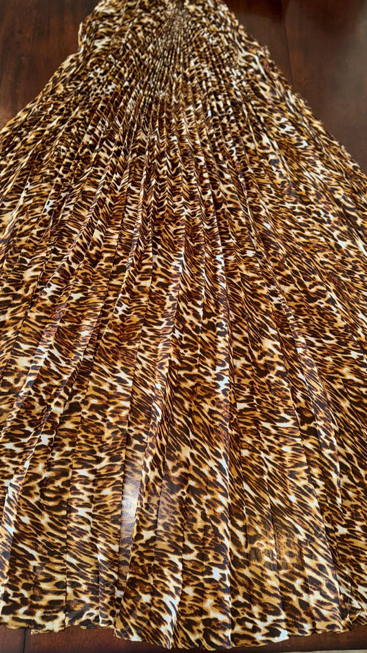 Sunburst pleated Silky Chiffon Leopard Design non stretch 190” length by 60” width Sold by the PC. Ships worldwide from Los Angeles CA