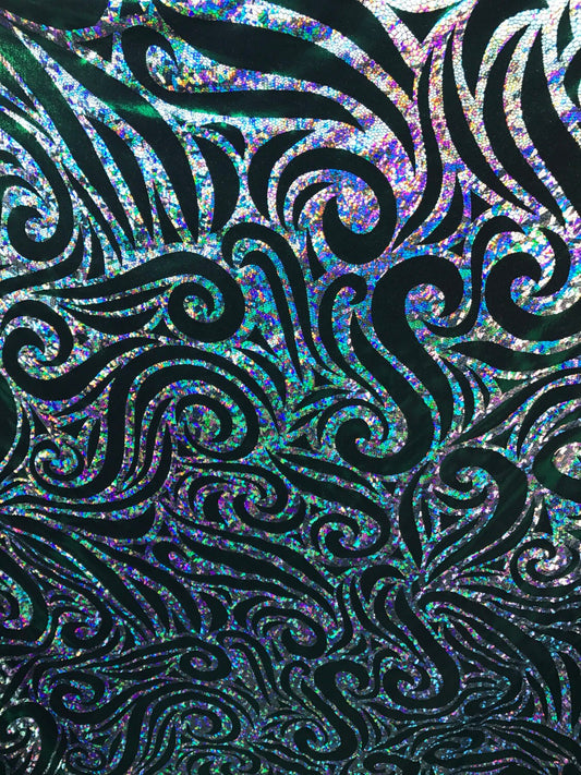 Swirl design Hologram foil green/silver on nylon spandex 4way Stretch 58/60" Sold by the yd. Ships worldwide from Los Angeles California.