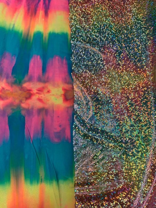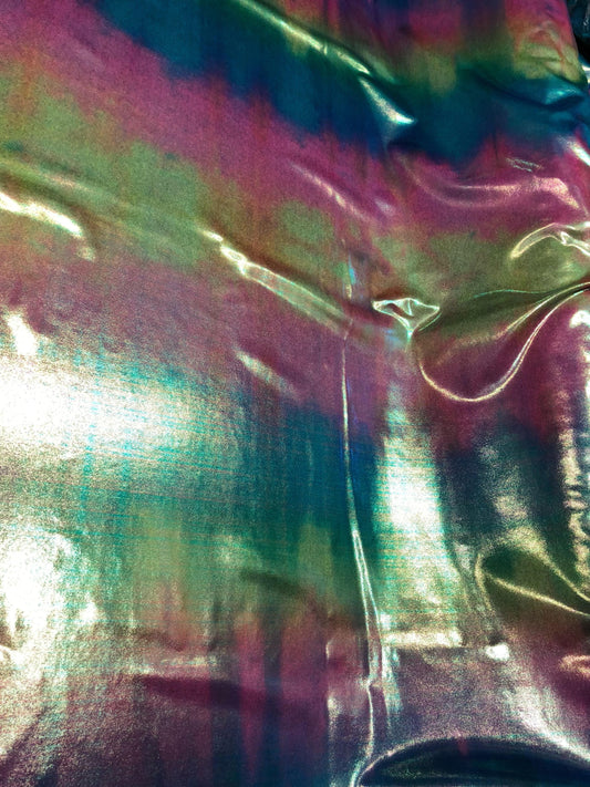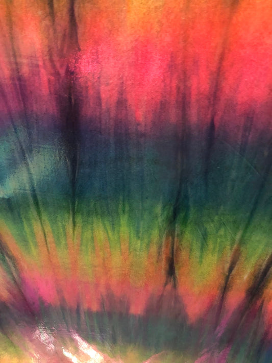 Tie dye metallic all over foil rainbow color nylon spandex 4way 58/60" Sold by the YD. Ships worldwide from Los Angeles California USA.