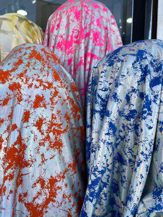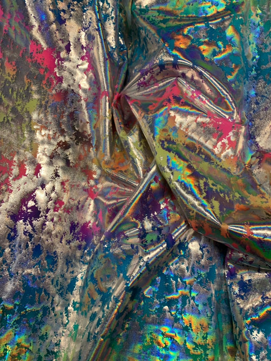 Tie dye splash design metallic iridescent foil on poly spandex 4way stretch 58/60” Sold by the YD. Ships worldwide from Los Angeles CA