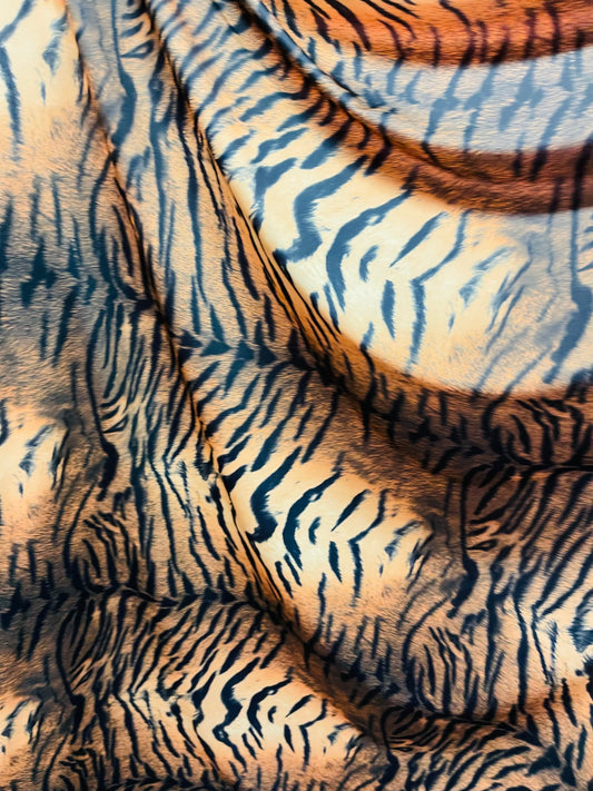 Tiger design Exotic animal print on best quality of stretch velvet 4-way stretch 58/60” Sold by the YD. Ships worldwide from Los Angeles CA