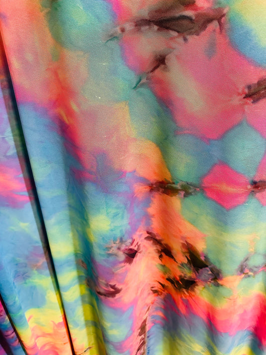 Tie dye power mesh multicolor 4-way stretch 58/60” Sold by the YD. Ships Worldwide from Los Angeles California USA.