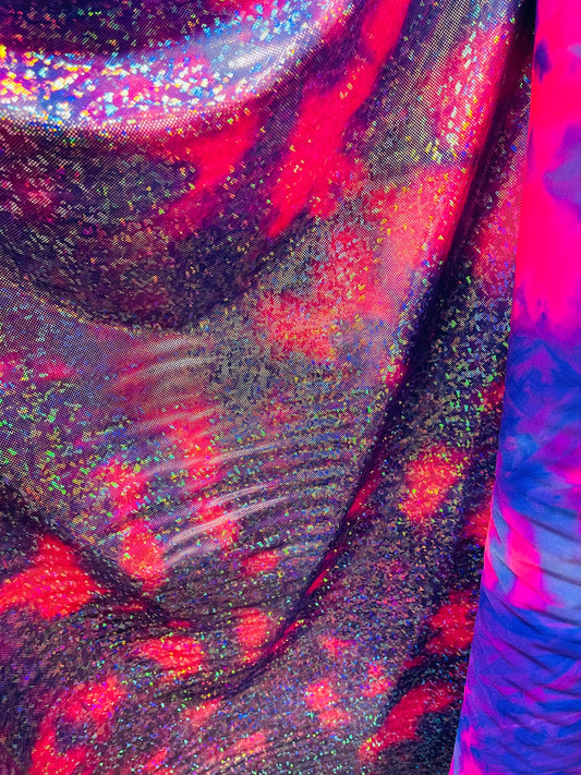 Tie dye shattered glass Purple/pink hologram metallic nylon spandex 4-way stretch 58/60” Sold by the YD. Ships Worldwide from Los Angeles CA