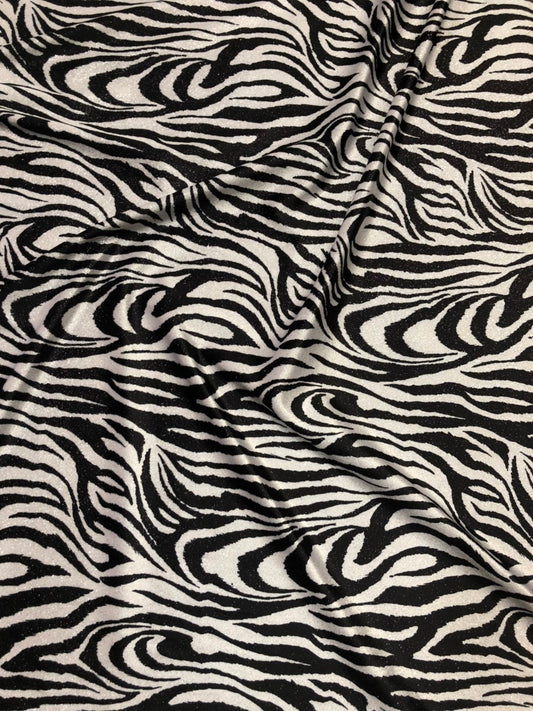 Zebra design with silver glitter on heavy stretch velvet 4way 58/60" Sold by the YD. Ships worldwide from Los Angeles California USA.