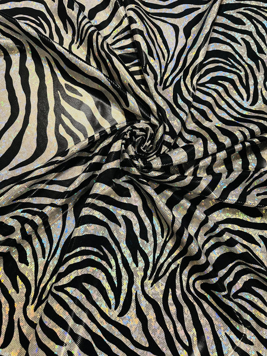 Zebra design exotic animal print on hologram metallic nylon spandex shattered glass 4-way stretch 58/60”